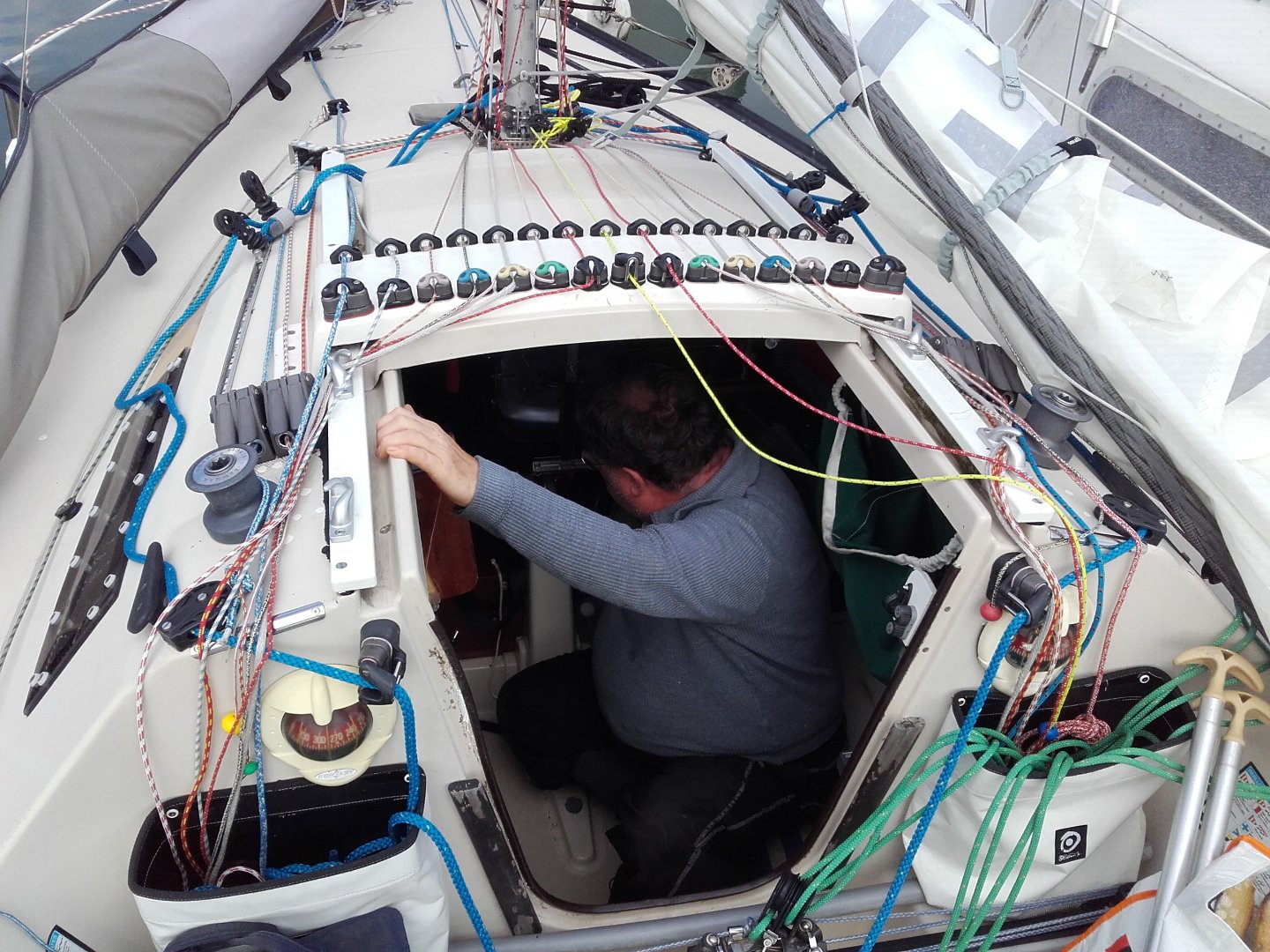 Mon ami Arnaud, dit Wayfarer, a publié ces photos de Croc-Mignon. Elles peuvent donner un aspect compliqué alors qu'en réalité le bateau est simple et conçu pour tout faire du cockpit, sans avoir à sortir sur le pont, pratique et sécurisant.