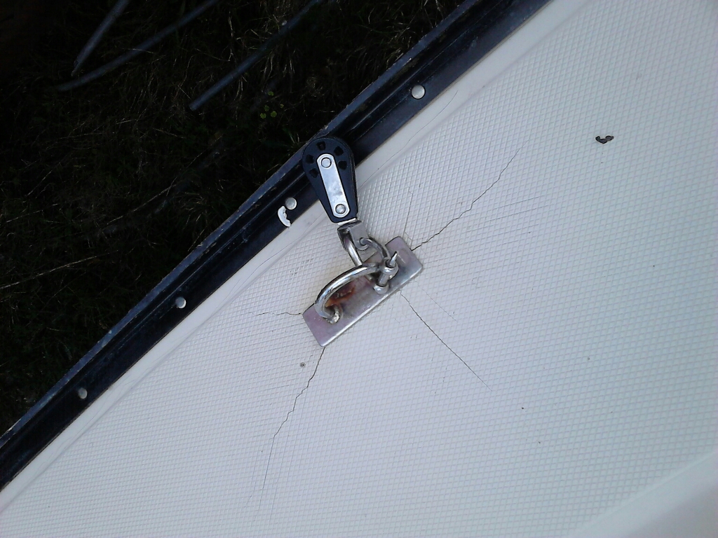 Il y a un peu de boulot mais rien de très grave à part cette cadène située à tribord qui m’inquiète un peu plus au niveau réparation. Elle sert bien entendu au maintien de la poulie d'écoute de spi mais également comme point de fixation de la béquille d'échouage. C'est d'ailleurs cette dernière qui a causé ces dégâts au dire de l'ancien proprio (elle a violement tapée le fond).