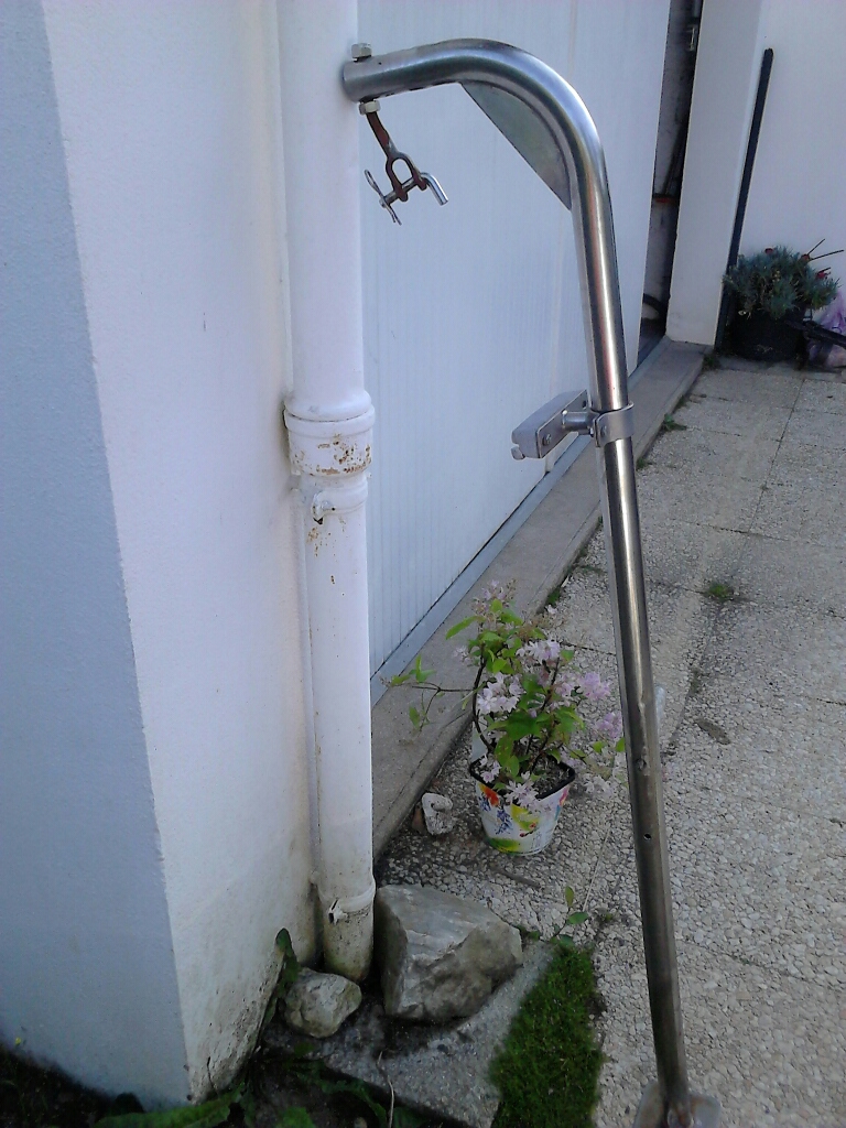 Petipas passe sa vie à l’échouage sur des béquilles assez économiques confectionnées à partir d’un profil d’enrouleur. Alu , légères, le patin en styrodur collé sika coté coque a 4 ans peut se changer aisément. La fixation se fait au travers du rail de fargue et du pied de chandelier par un taraudage en 8. L’effort vertical est repris par la liaison pont-coque, assez solide à cet endroit là. Si une balade vous mène vers la Trinité...