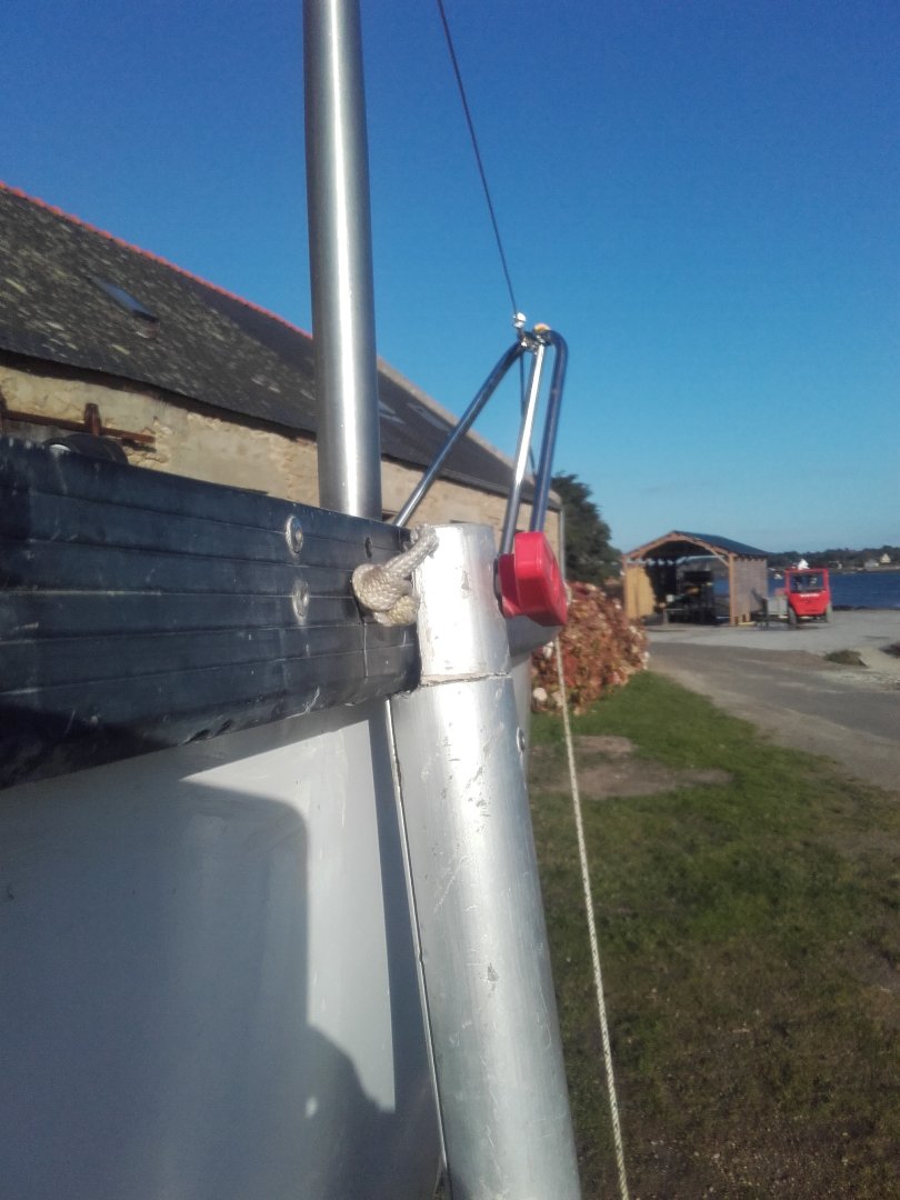 Merci Jean Yves pour ces explications :D . Il n'y a pas de renforts en dessous, je vais changer la localisation du point de fixation comme conseillé. Ci joint une photo de la béquille et du système d'ancrage d'origine (qui a pris cher). Je vais réfléchir à implanter un support sur la carène ou sous le rail de fargue. Par contre, la partie coudée avec ces 4 perçages est particuliaire et semble pas très adaptée => 2 options. Soit je coupe ces coudes, j'obtiens des béquille droites et le bateau sera posé dessus. Soit je les garde et je déplace les béquilles un peu plus vers l'extérieur en rallongeant l'axe tampon/bequille et le bateau sera "suspendu". À voir.