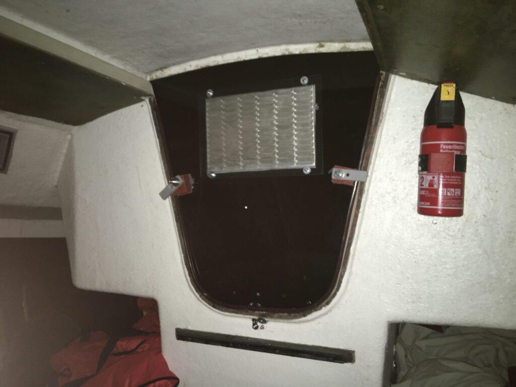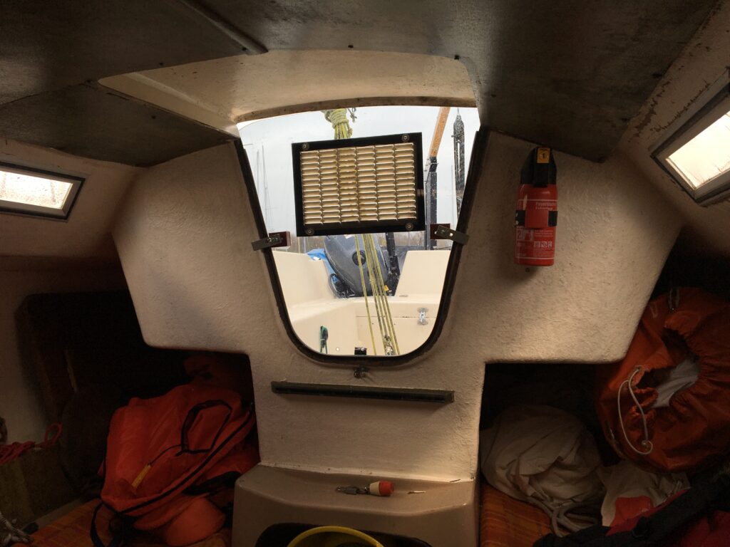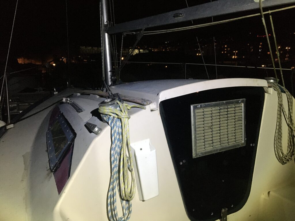Pour le génois, quand je prépare le génois je fais passer un bout (rouge) le long de l’était et en bas, j’ai installé une poulie qui renvois le bout au cockpit, ce qui me permet de descendre le génois sans sortir du cockpit.
