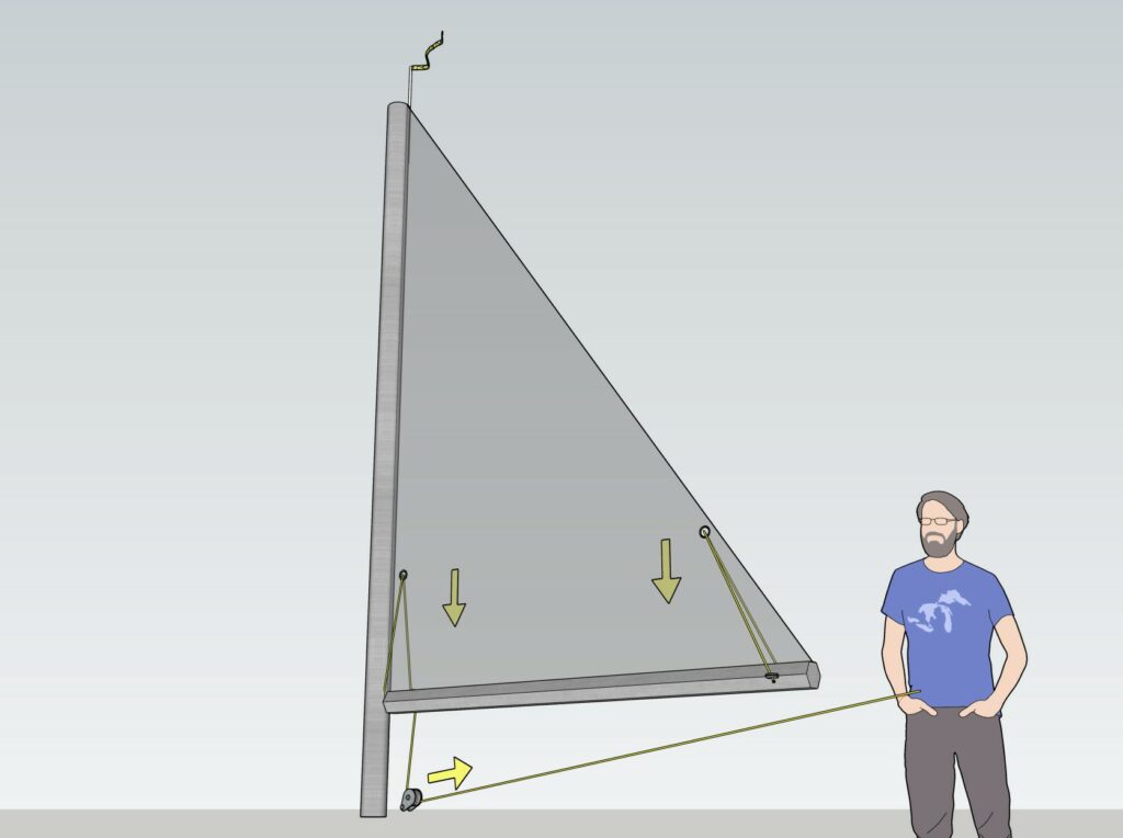 Je partage ici le système que j’utilise pour prendre un ris. Je met le bateau au près, je choque la GV et je libère la drisse de GV. je tire sur le bout du « système », éventuellement je le fini au winch, je hisse la GV et la borde.