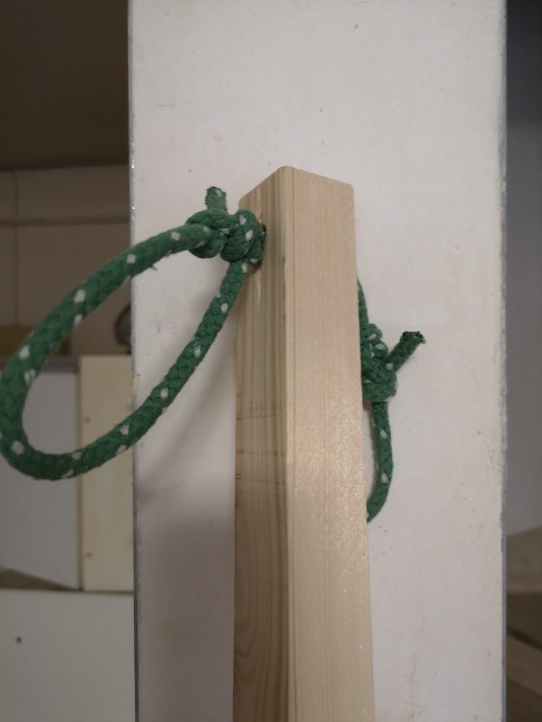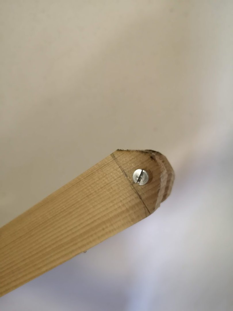 La "perche" est réalisée en bois, avec des renforts latéraux et un renfort longitudinal en bois, boulonnés entre eux et fixés avec des garcettes sur le balcon et respectivement sur le chariot d'écoute de grand voile.