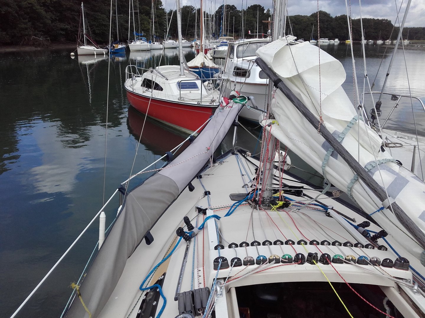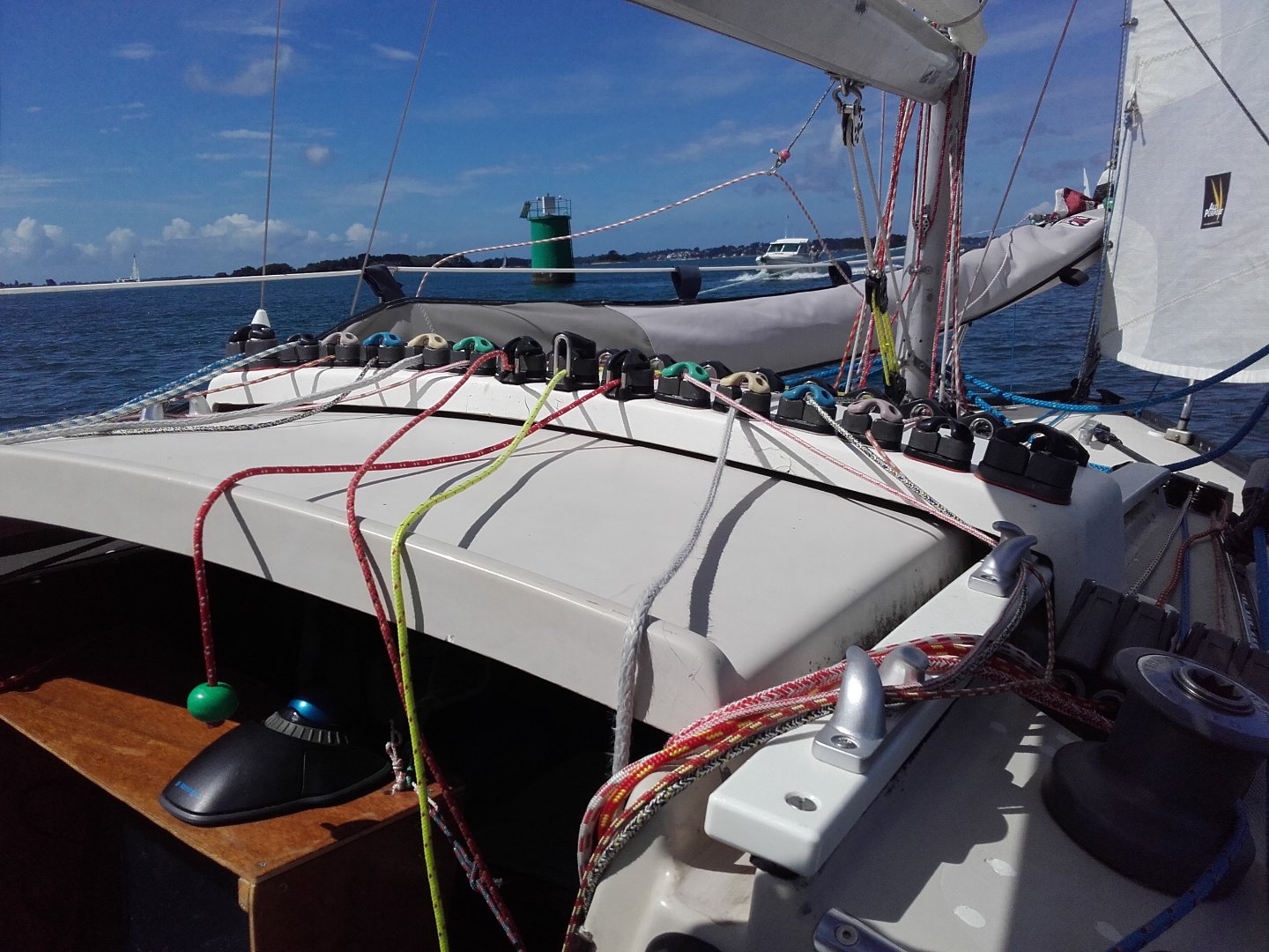 Mon ami Arnaud, dit Wayfarer, a publié ces photos de Croc-Mignon. Elles peuvent donner un aspect compliqué alors qu'en réalité le bateau est simple et conçu pour tout faire du cockpit, sans avoir à sortir sur le pont, pratique et sécurisant.