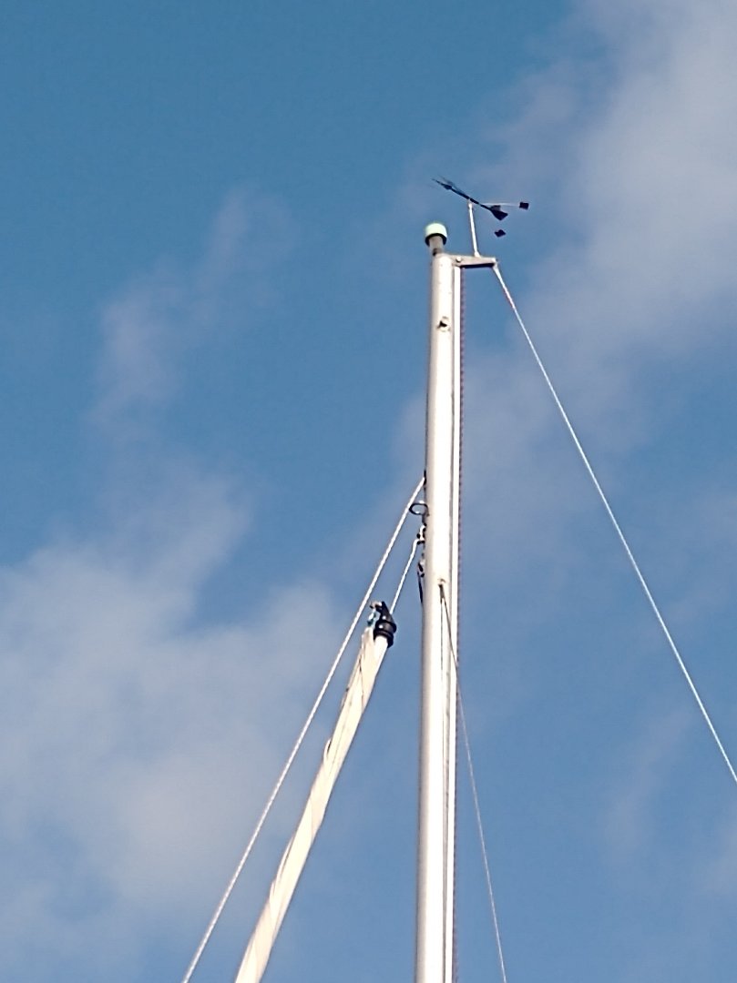 * Le tourmentin utilise comme drisse l'ancienne balancine de tangon, juste au dessus des barres de flèches. Il comporte un étai volant incorporé. Cette voile est théorique, je ne l'ai jamais utilisée car elle correspond à des conditions où je suis mieux à quai. Mais elle est réglementaire et on peut se faire contrôler lors de traversées un peu longues et au large comme Noirmoutier-Belle Île où les petits bateaux sont rares et attirent les autorités.