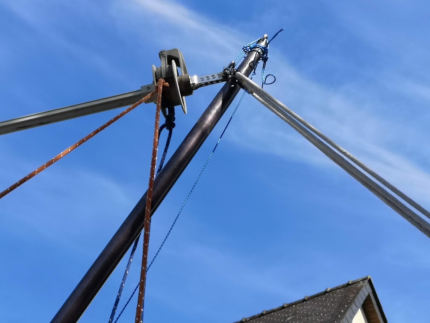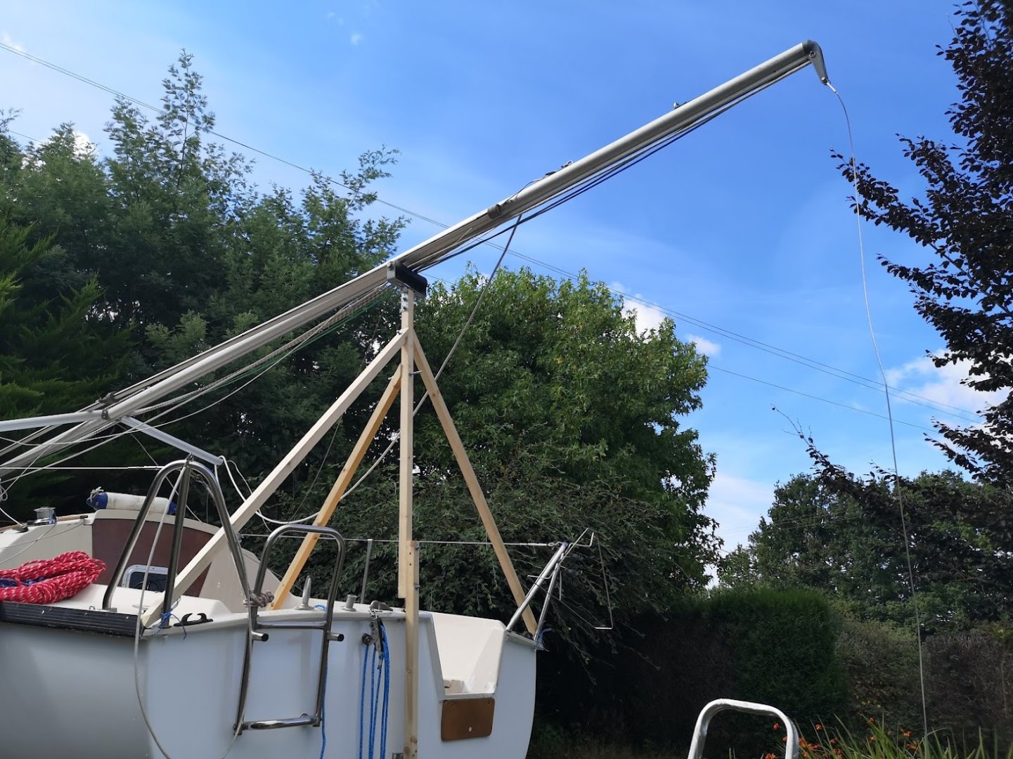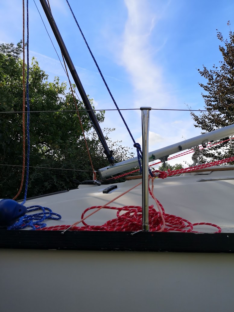Sur le devant du mat, j'ai fixé un pontet inox (diamètre 6), sur lequel j'attache le tangon (avec un morceau de chambre à air pour protéger).