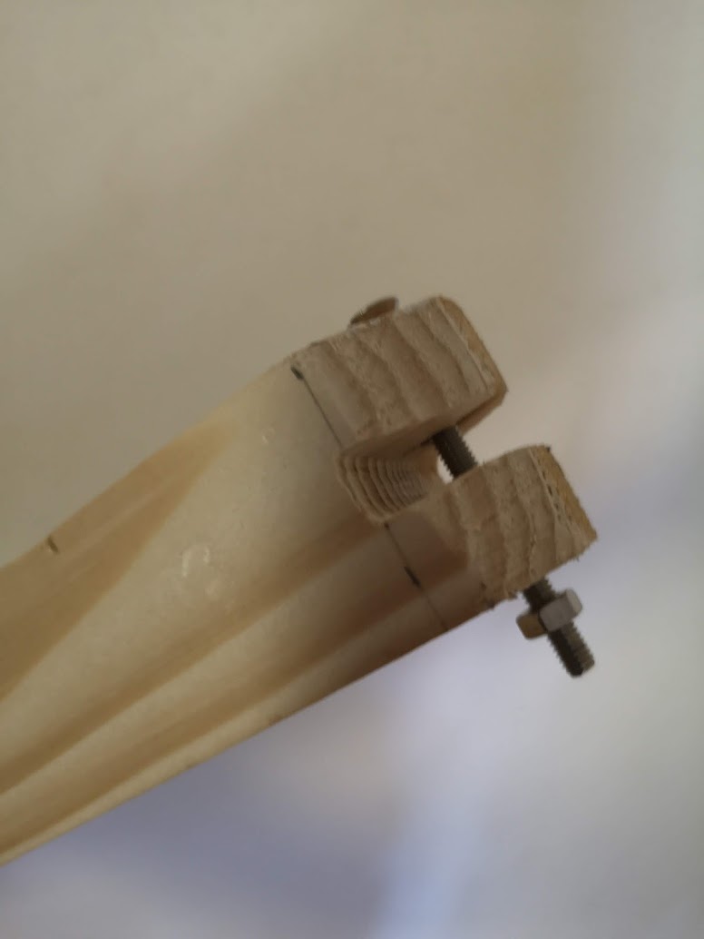 La "perche" est réalisée en bois, avec des renforts latéraux et un renfort longitudinal en bois, boulonnés entre eux et fixés avec des garcettes sur le balcon et respectivement sur le chariot d'écoute de grand voile.
