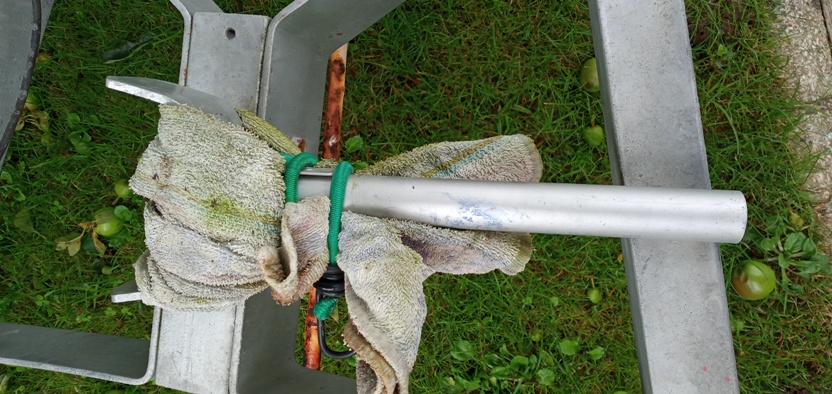 Mon réglage pour le tangon (de moins de 90°) me permet de l’approcher très près du balcon, le reste du mouvement ne nécessite plus de force. Le tangon se fixe sur un oeil popé en face avant du pied de mat. Il est, comme le mat, frappésur les itagues du rail de fargue sur l'axe de la rotation.