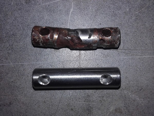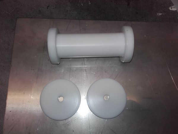 les nouveaux patins et l'entretoise qui va sur l'axe refabriqués en "pom" (polyoxyméthylène)
