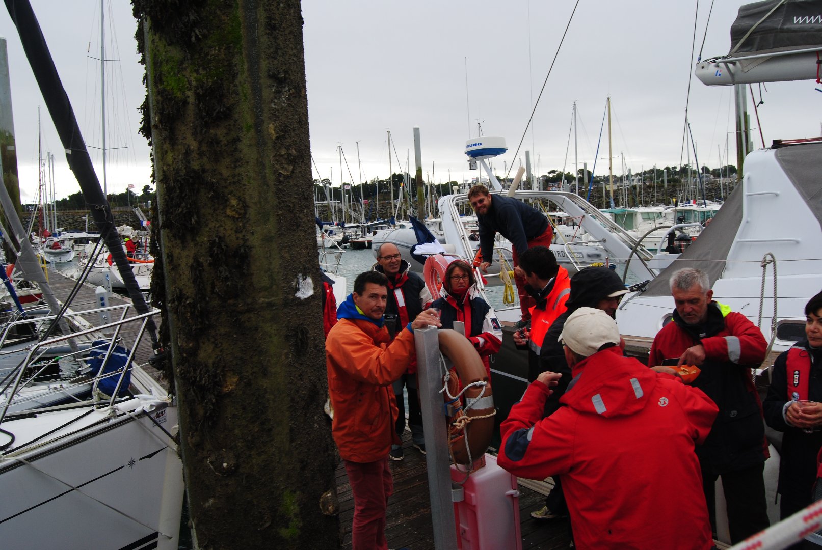 Au matin du samedi, accompagnée par la toujours fidèle équipe du port de Binic – Yann et Annie – l’armada a donc pris la mer sur les coups de 9h00, non sans avoir au préalable englouti un café croissants offert par l’APFirst dans la Cocotte du port. Un petit déjeuner bienvenu avant d’affronter des conditions de mer dantesques : un vent de 0,002 nœuds et une pluie ininterrompue toute la matinée et rafraîchissante comme jamais… Et dire qu’il faisait presque 30°C sur l’eau le week-end d’avant !!! Sans compter un courant de grande marée bientôt contraire à la route à suivre…